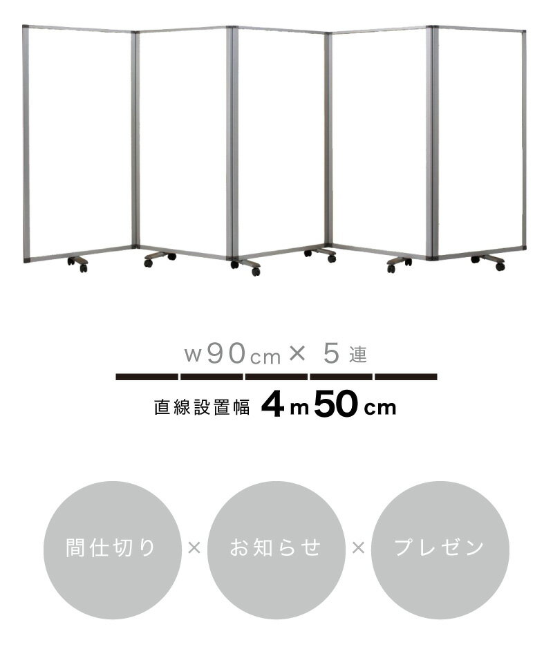 本体サイズ(cm)(約)高さ180 × 奥行35 × 幅450有効内寸:W79.7×H165.5cm/面 ×5面その他サイズ折りたたみ時:幅90 ×奥行45商品仕様【表面材】スチール、フレーム:アルミ(シルバー)、フレームコーナー:ナイロン、 連結部:強化ナイロン、芯材:MDF、 キャスター:ナイロン、キャスターベース:アルミ(シルバー)、ベースキャップ:ナイロン/キャスター:M8・直径50mm(全てストッパー付)、固定ボルト:M6×45mm【付属品】スパナ(対辺14mm)×1本、レンチ(対辺5mm)×1本商品重量(kg)約 49kg組み立てお客様ご自身で要組み立て備考 商品画像は色合いや素材感が実際の商品と異なる場合がございます。